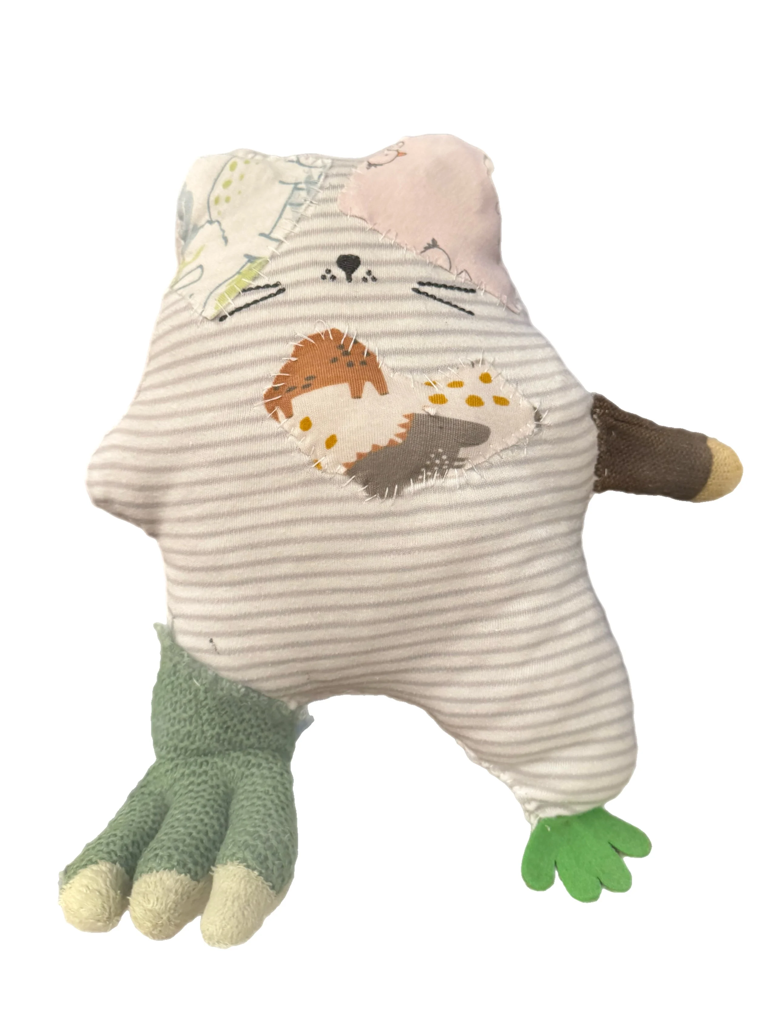 Crafted from upcycled baby fabrics, designed for the softest hugs. His eyes and heart bear careful stitches, patched with a baby’s well-loved drool cloth. His little feet were once part of a child’s dinosaur pajamas.
